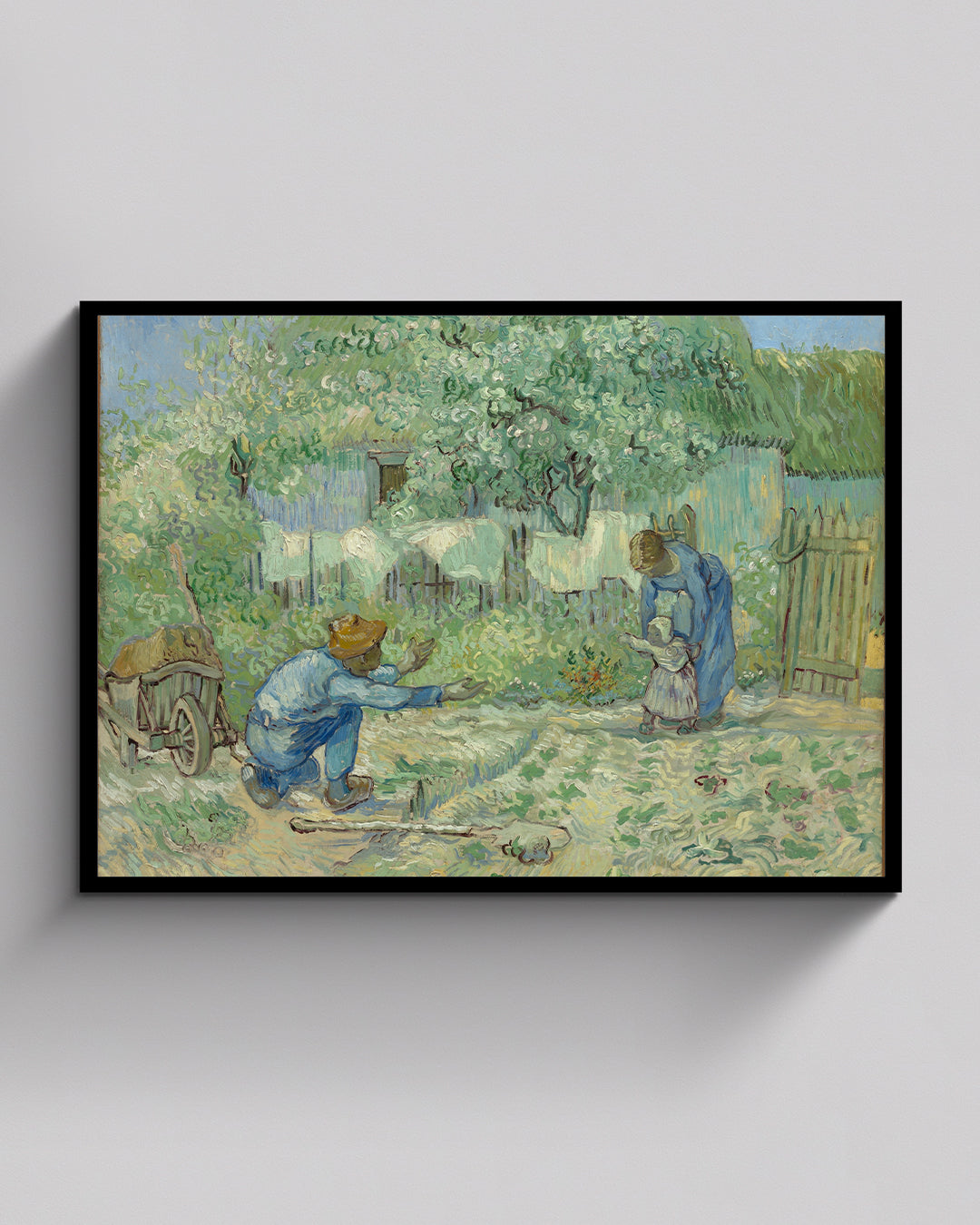 Während seines freiwilligen Aufenthalts in der Anstalt von Saint-Rémy schuf Vincent van Gogh eine Reihe von Werken nach Künstlern, die er bewunderte, und behandelte sie eher als kreative Übersetzungen denn als direkte Kopien. Für dieses Gemälde vom Januar 1890 übertrug er eine Fotografie von Jean François Millets Die ersten Schritte auf die Leinwand und interpretierte sie durch Farbe und expressiven Pinselstrich neu.