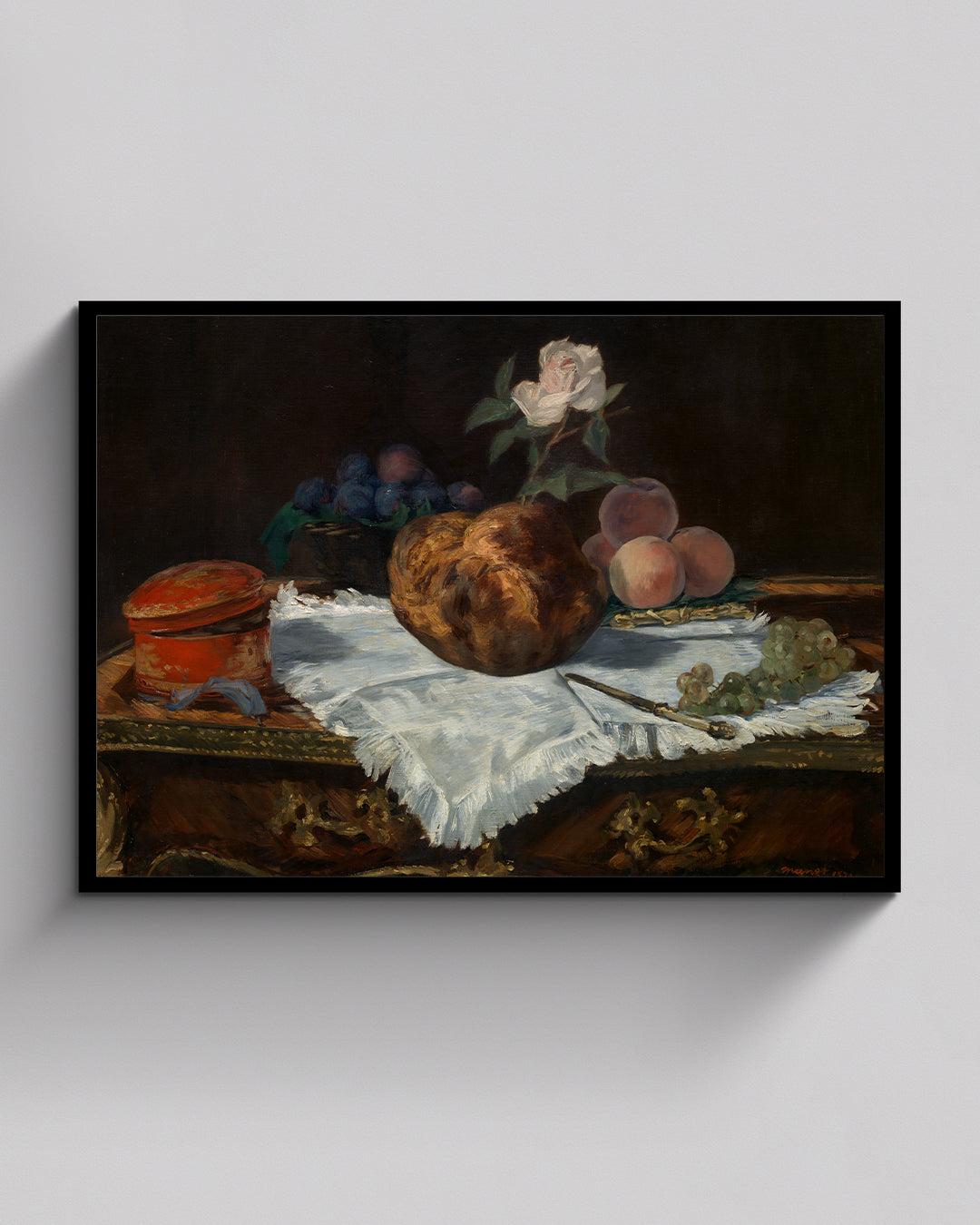 Édouard Manet nannte das Stillleben den „Prüfstein des Malers“, und dieses Werk ist das letzte und aufwendigste Beispiel seiner großen Tischkompositionen von 1862–1870. Inspiriert von einem Brioche-Gemälde von Jean Siméon Chardin, das kürzlich dem Louvre gestiftet wurde, verwandelt Manet das Genre in ein Fest für die Sinne.